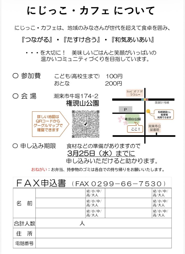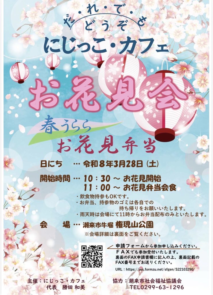 更新日付: 2026年03月12日 印刷する 【再掲】3月のにじっこ・カフェが開催されます 3月28日(土)10時30分~ 今回はお花見会となります。 場所は権現山公園となります。 →申込締切 3月25日(水) 申込は、FAX 0299-66-7530、または二次元コードからお願いします。 みなさまのご参加お待ちしております! 一覧にもどる